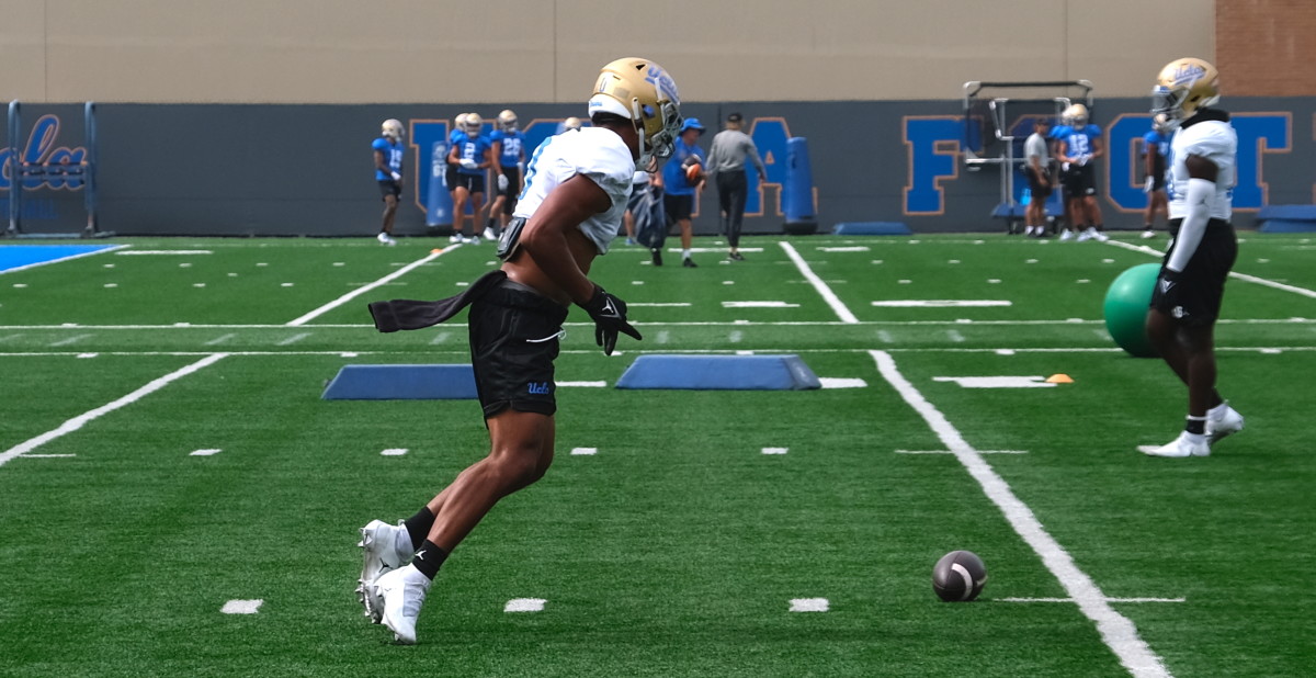 The Bruins then lined up in punt formation to practice some live-speed drills on that front. Receiver Kyle Philips was the first to haul one in, and he was joined by receiver Logan Loya, receiver Kazmeir Allen, running back Keegan Jones and receiver Kam Brown.